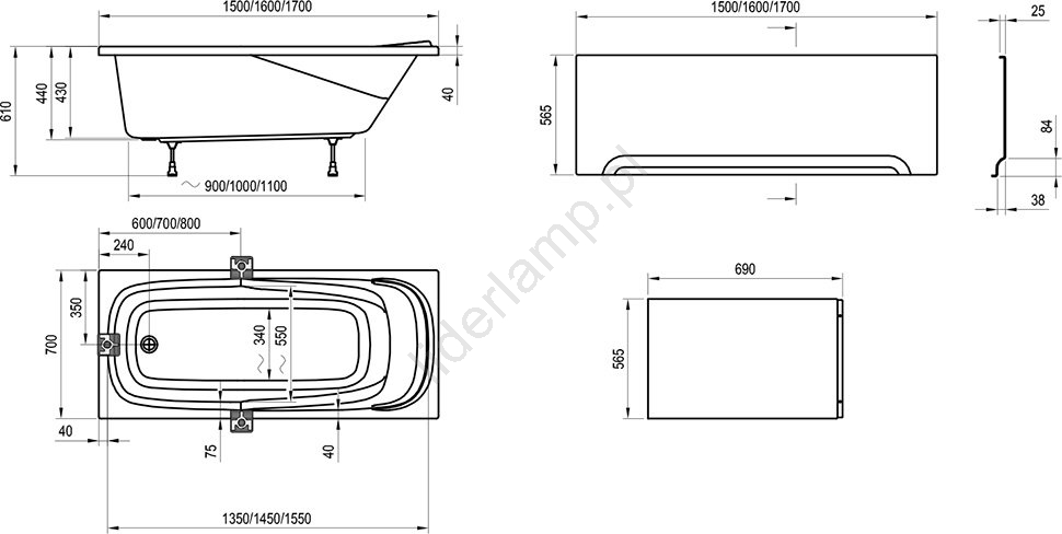 • Wannę można wyposażyć w panel przedni, nie jest on częścią wanny, można go dokupić osobno.