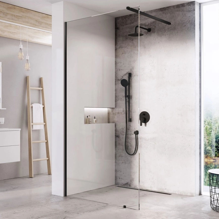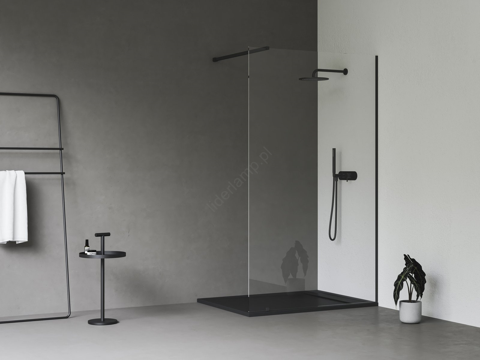• Panel szklany o szerokości 100 cm i wysokości 200 cm uzupełniony jest profilem montażowym w kolorze czarnym, który podkreśla elegancki wygląd całej strefy prysznicowej.