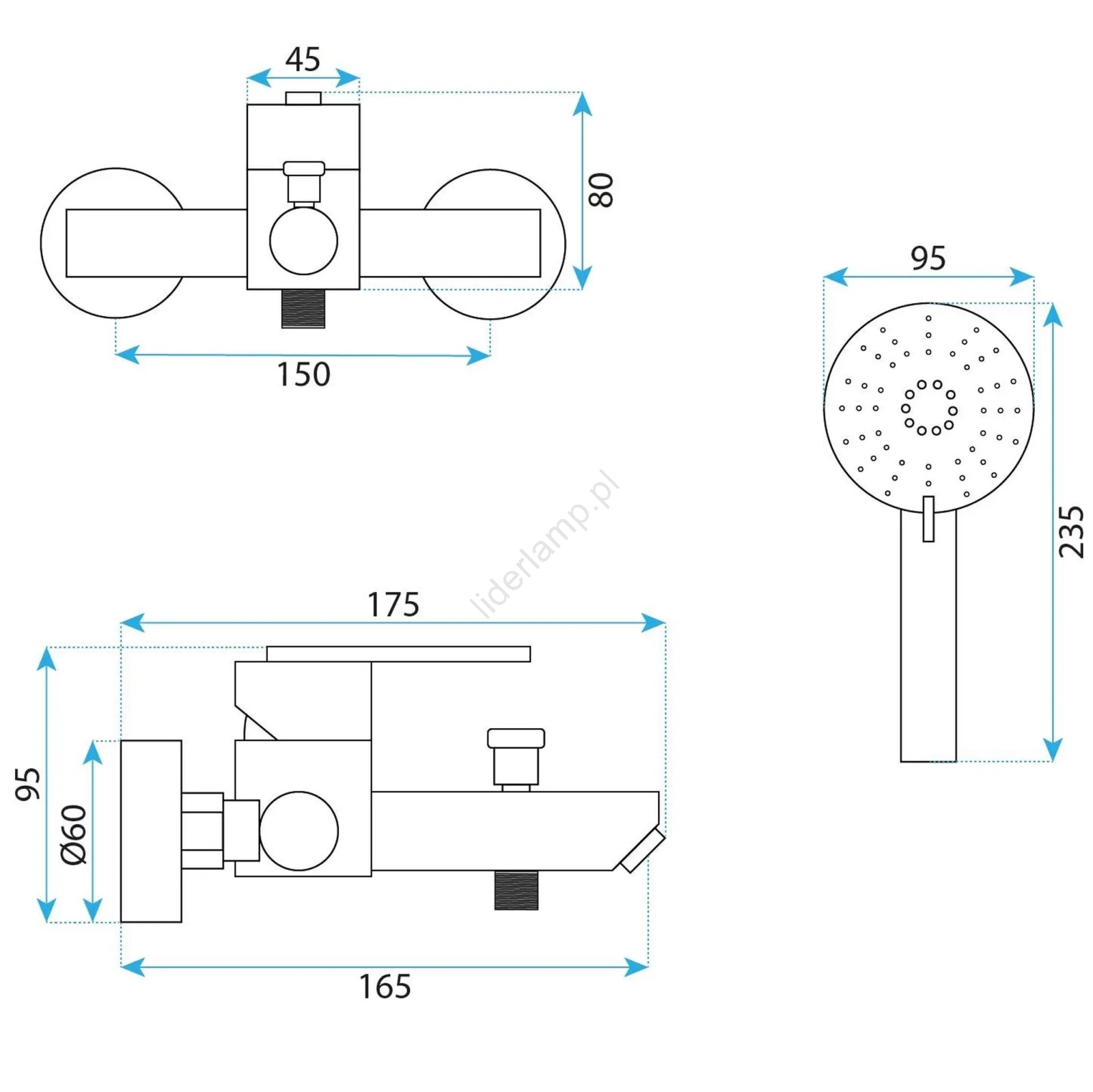 • Zestaw zawiera: baterię wannową, słuchawkę prysznicową, wąż prysznicowy i uchwyt na słuchawkę prysznicową.