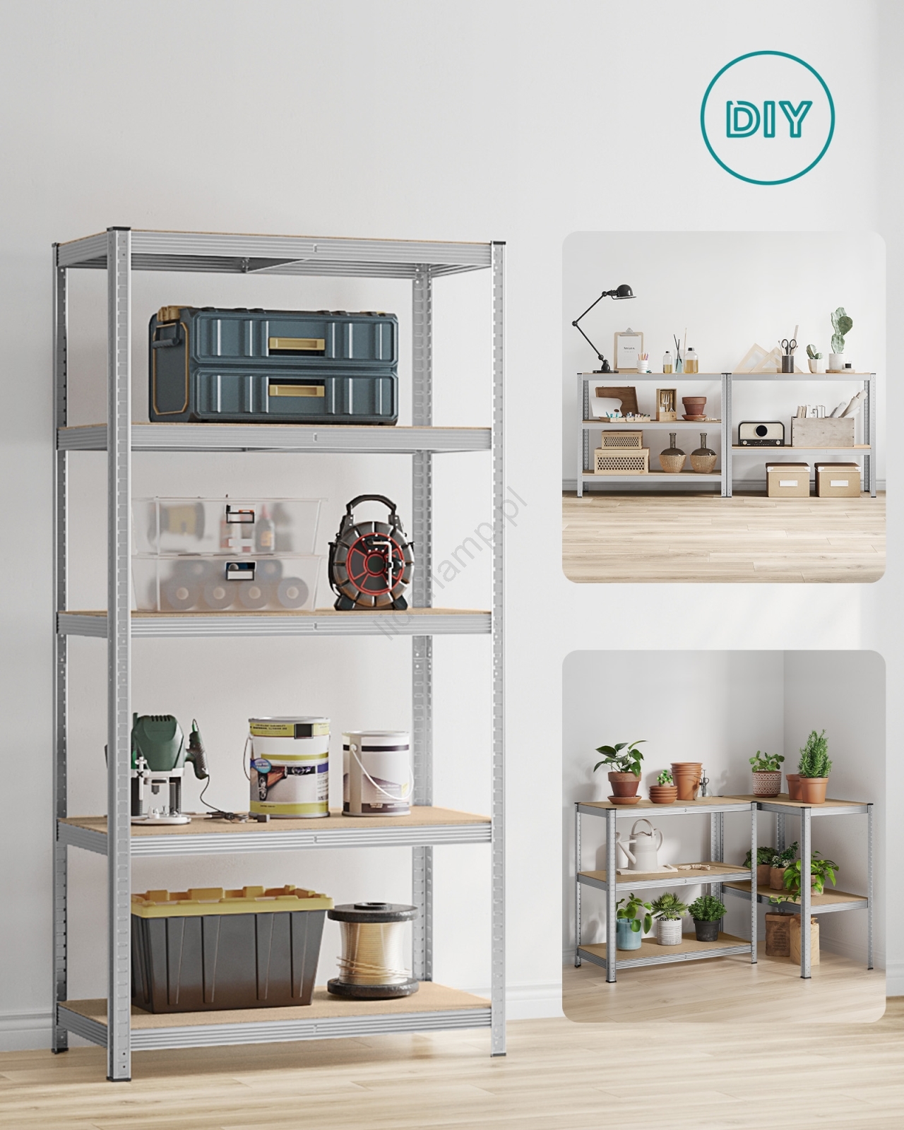 • Każda półka udźwignie do 120 kg i bezpiecznie pomieści farby, narzędzia oraz sprzęt fitness.