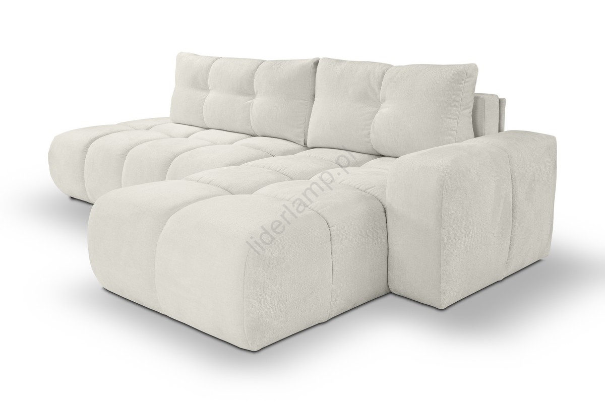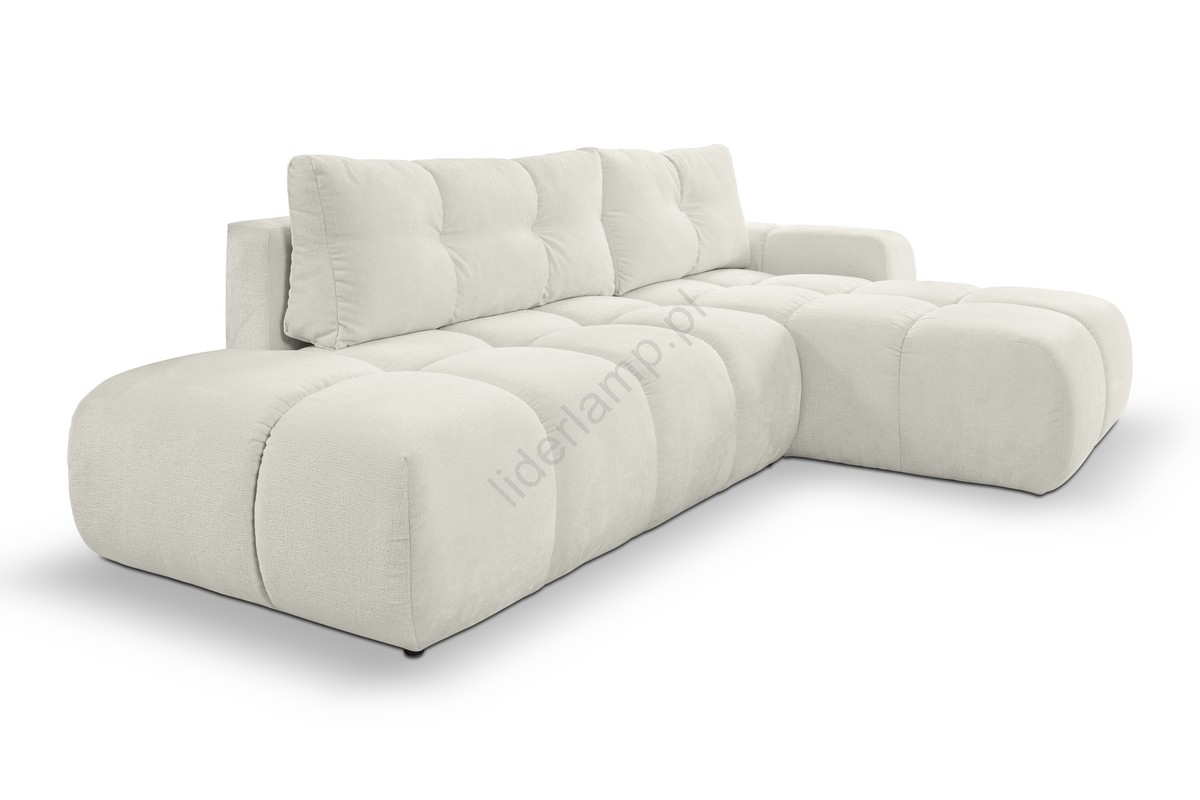 • Rozkładany narożnik tapicerowany z pojemnikiem na pościel w układzie L ALMADA — prawostronny, beżowy