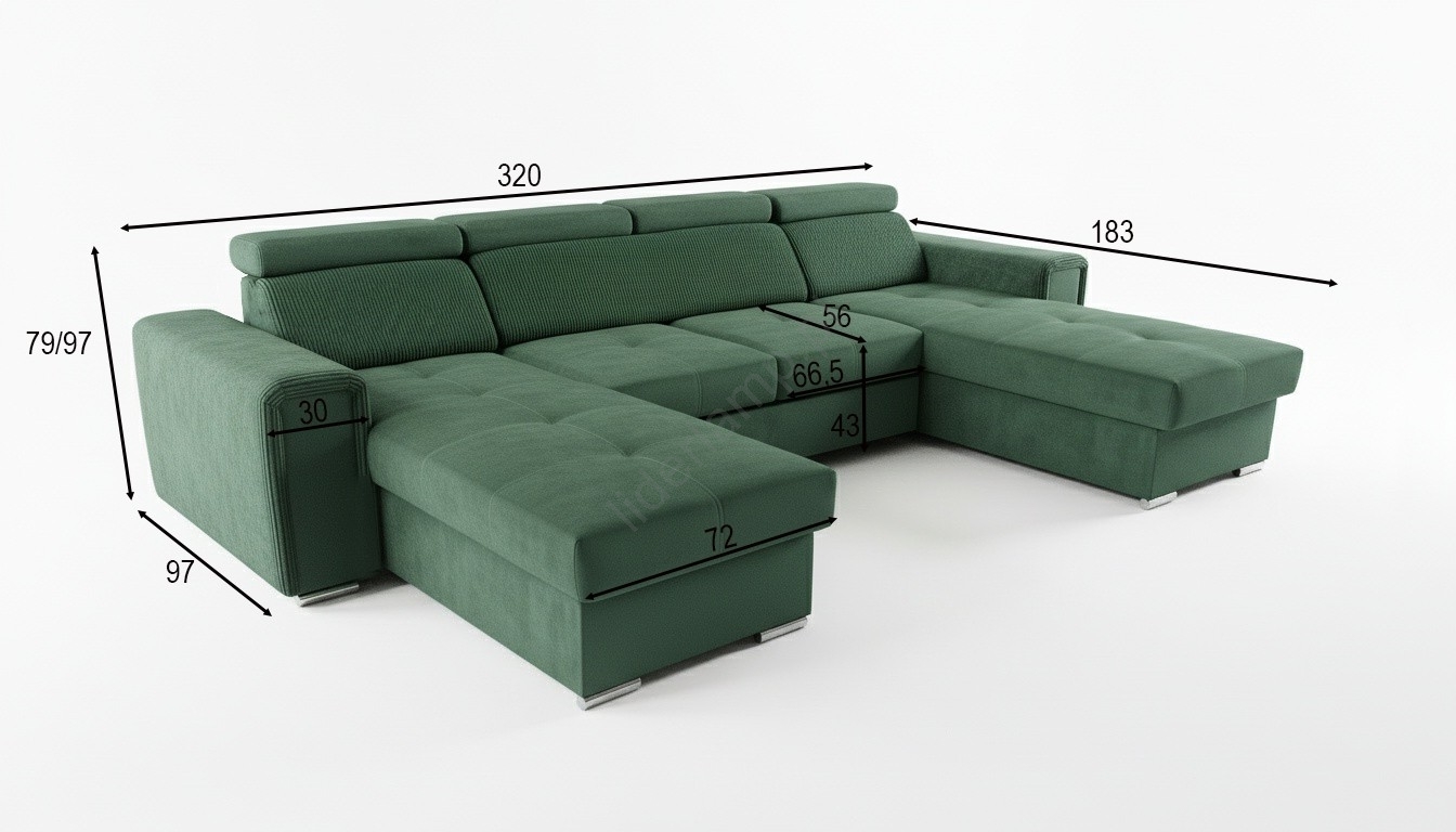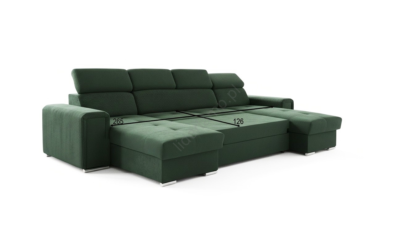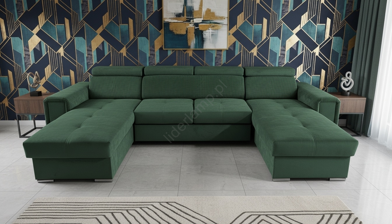 • Rozkładana sofa narożna w kształcie litery U z pojemnikiem na przechowywanie SALVADA zielona