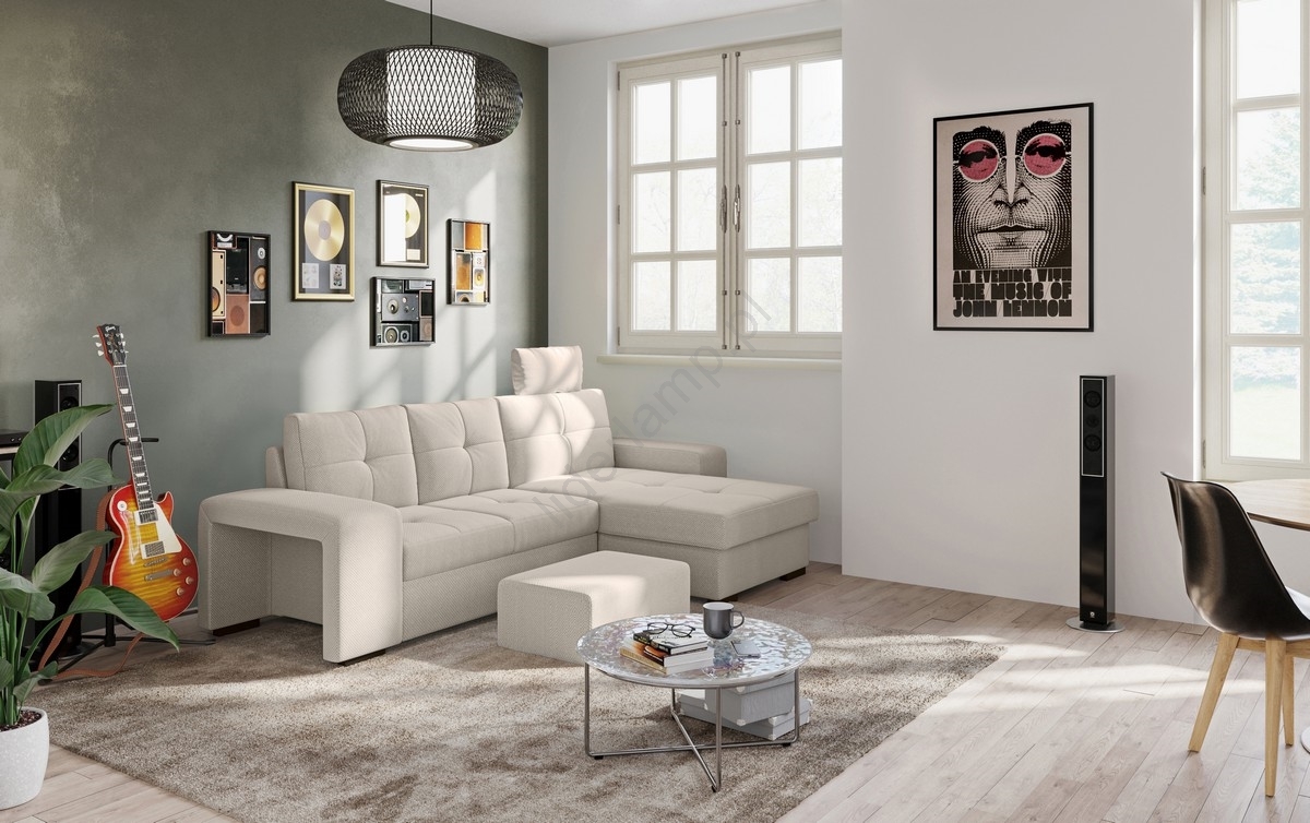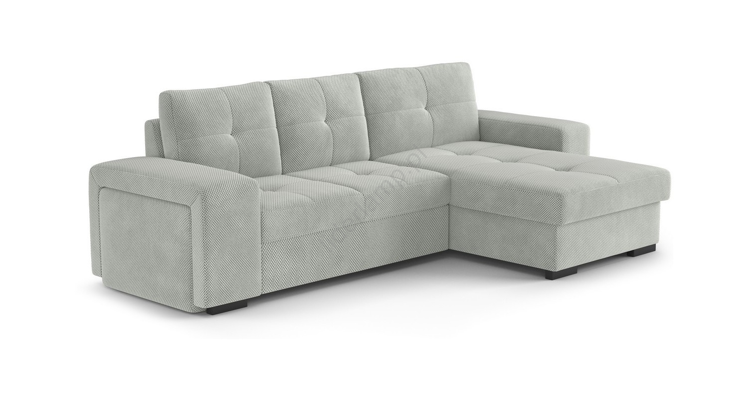 • Dzięki nowoczesnemu pikowaniu i przemyślanej konstrukcji ten narożnik jest idealny do mniejszych pomieszczeń, a jednocześnie oferuje duże łóżko i wystarczającą przestrzeń do przechowywania.