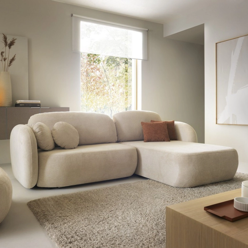 Narożna rozkładana sofa z pojemnikiem w kształcie L OLBIA, prawostronna, beżowa