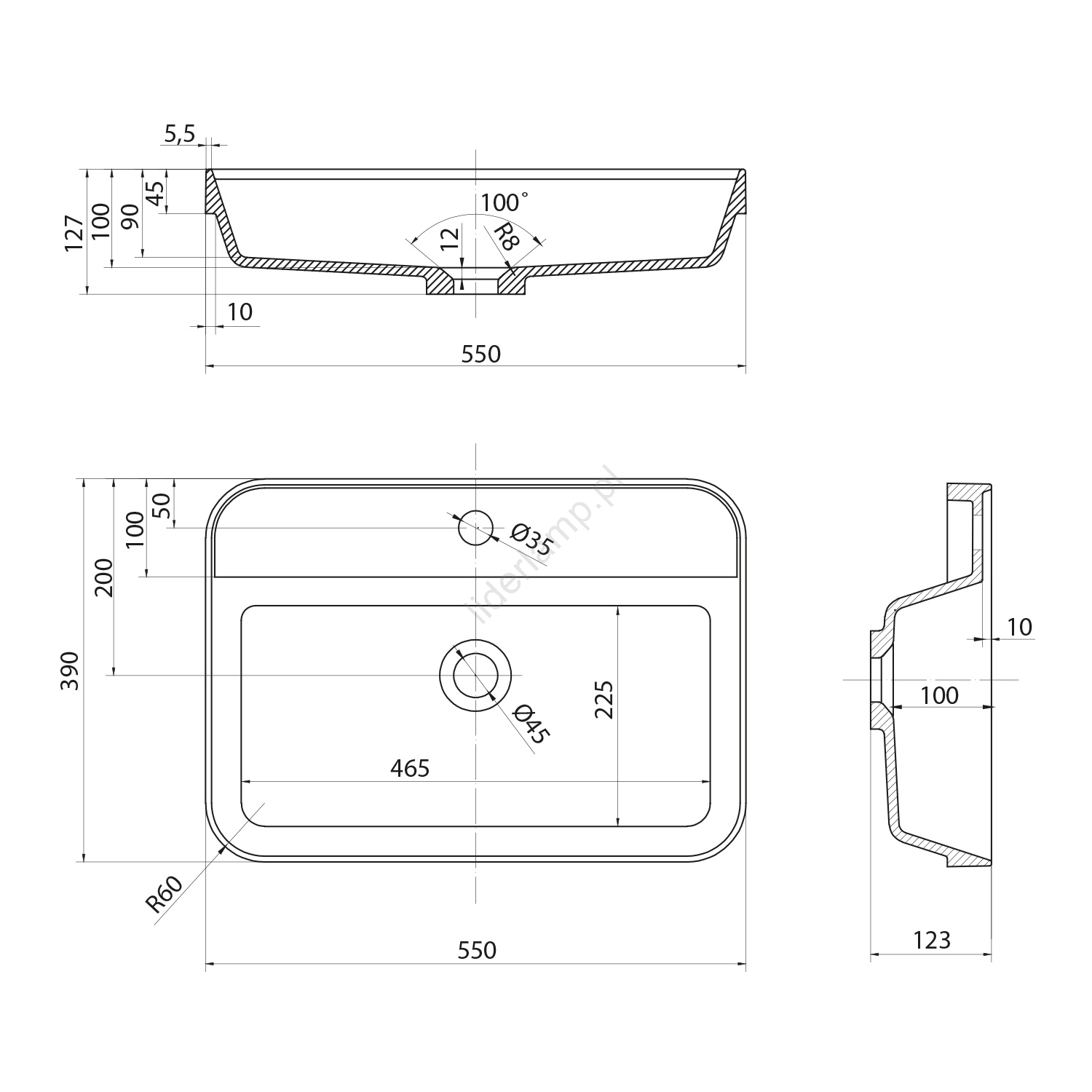 • Ma wymiary 550x390 mm i wysokość 123 mm.