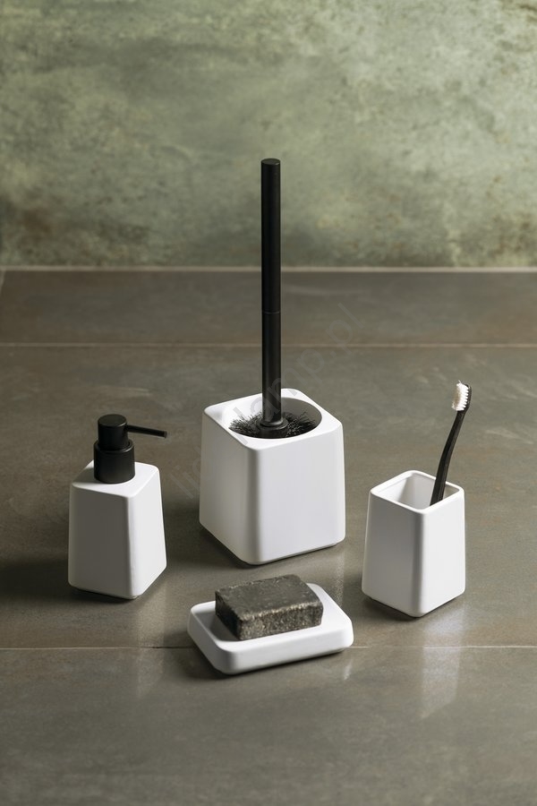 • Zestaw akcesoriów łazienkowych zawiera mydelniczkę, kubek, dozownik i szczotkę WC.
