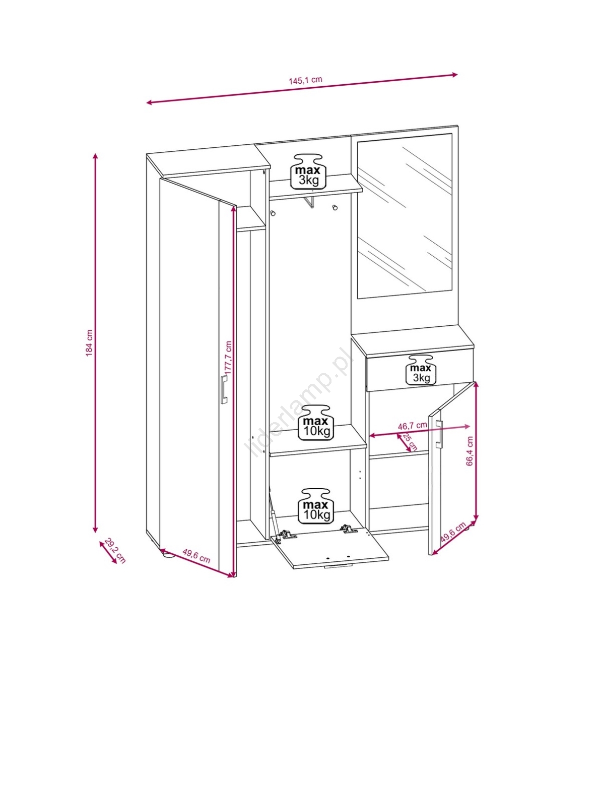 • Półki, haczyki, drążek na płaszcze i duże lustro zapewniają wszystko, czego potrzebujesz.