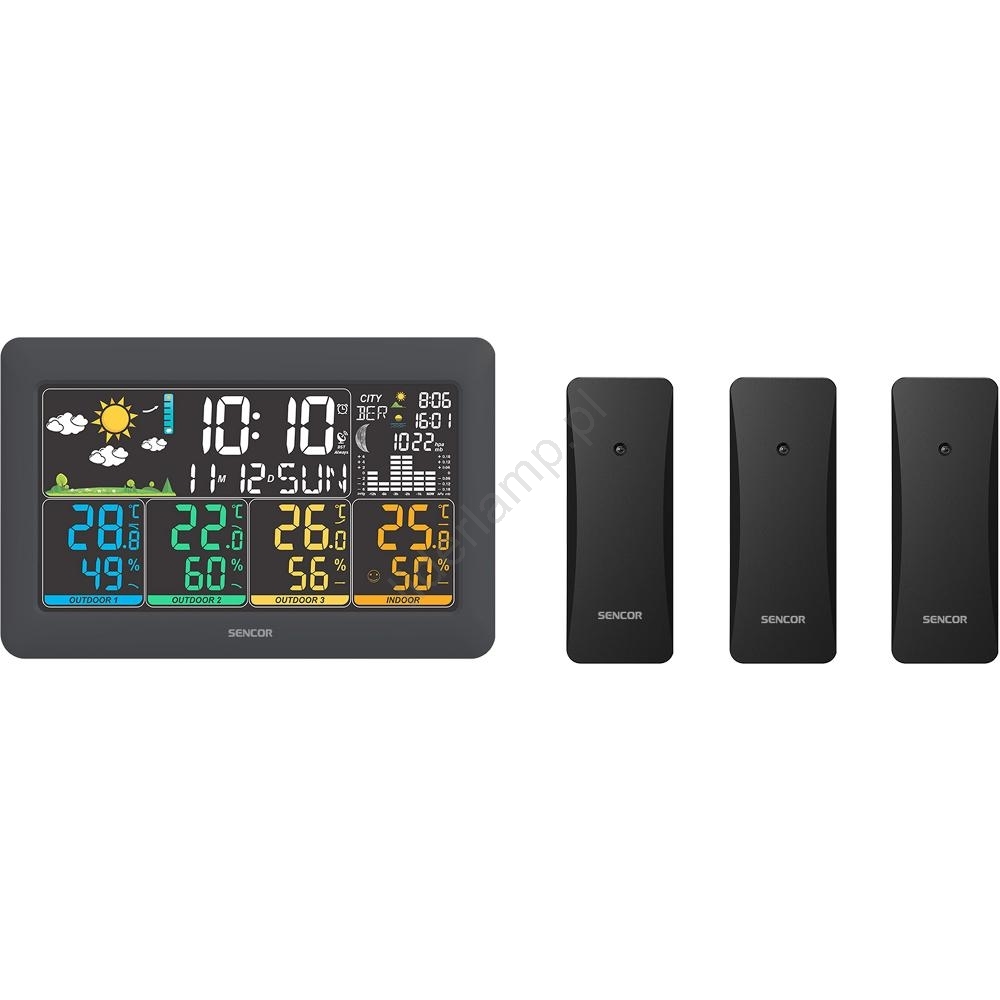 Sencor - Stacja pogodowa z kolorowym wyświetlaczem LCD, 3 czujnikami 3xAA + 6xAA, czarna