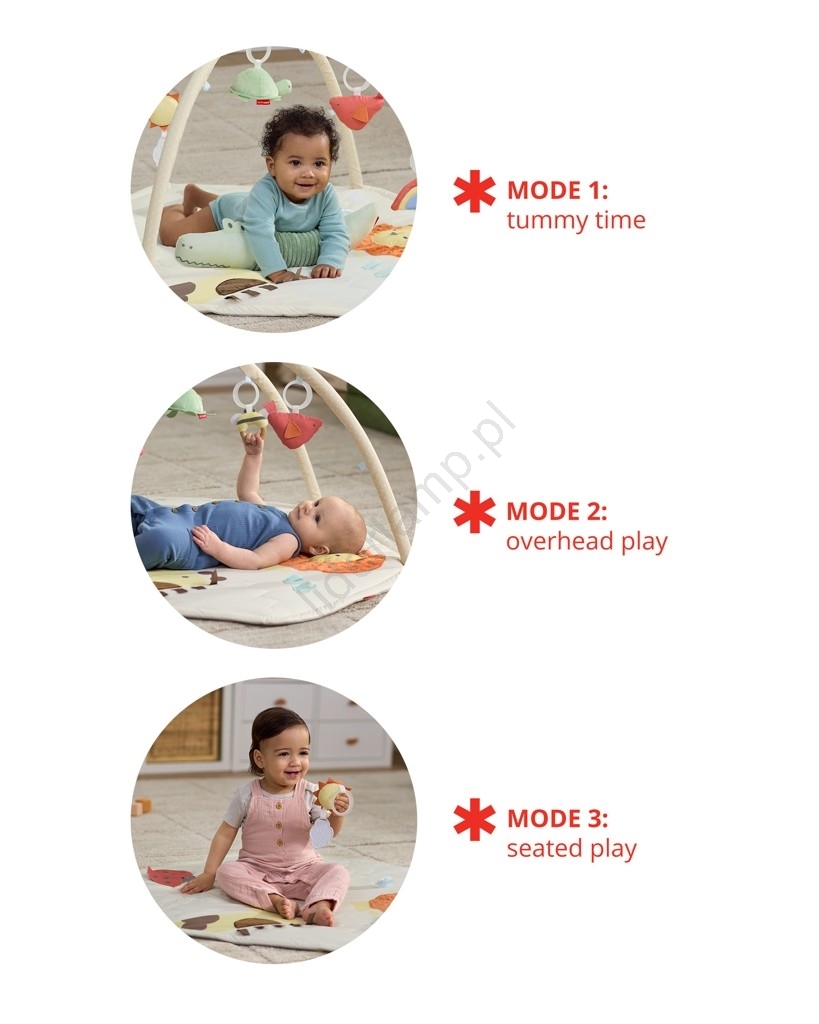 • Oferuje 3 pozycje do zabawy: na brzuszku, na plecach oraz w pozycji siedzącej.