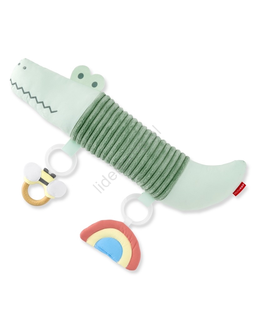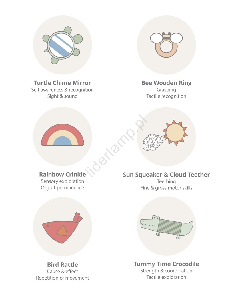 • Zawiera 5 zawieszanych zabawek, np. żółwia z lusterkiem, piszczące słoneczko z gryzakiem lub szeleszczącą tęczę.