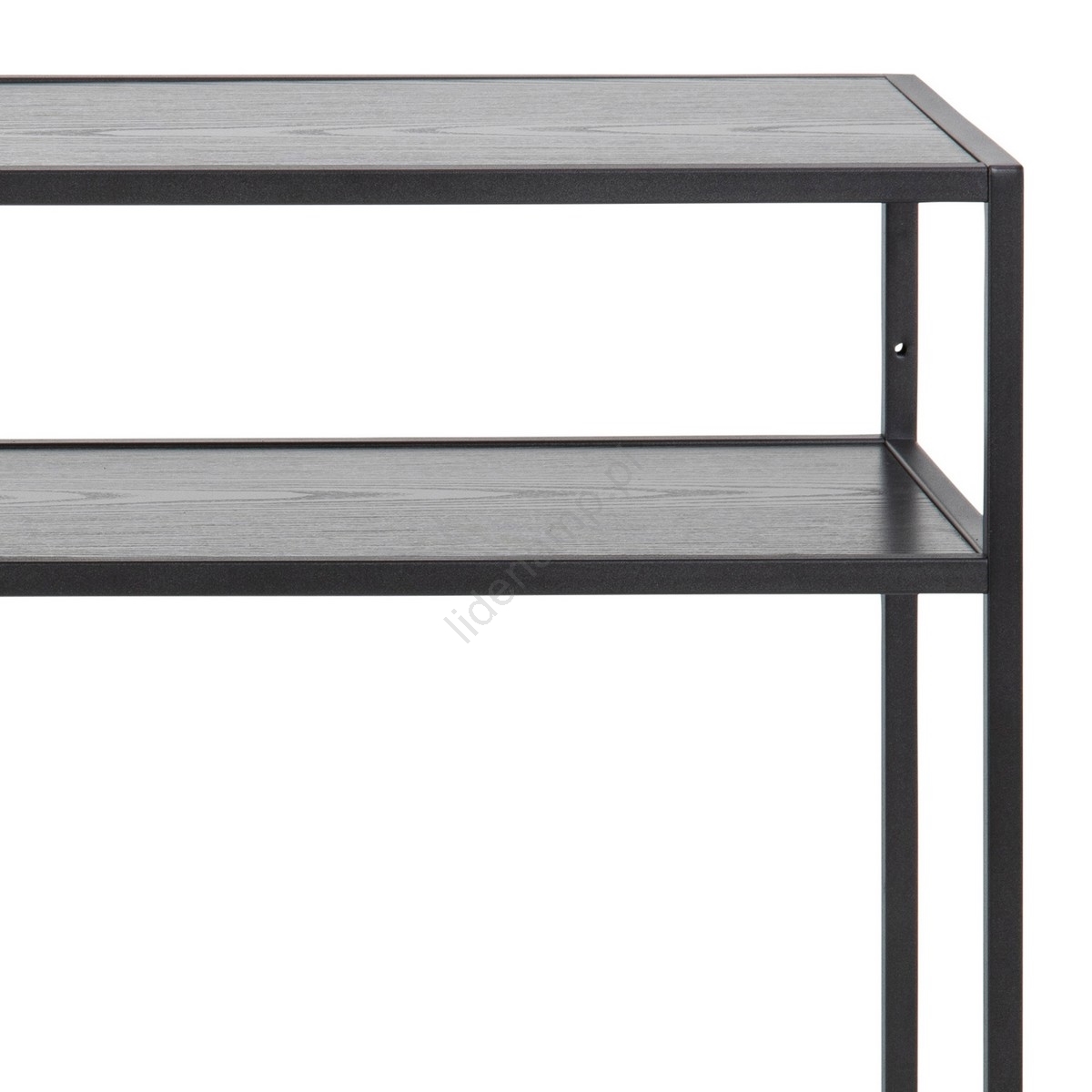 • Blat i półki z czarnej melaminy o grubym wykończeniu, stelaż z matowej czarnej stali z grubą powłoką proszkową.