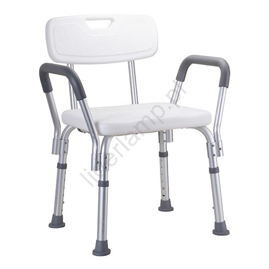 • Krzesło prysznicowe z oparciem i podłokietnikami, zapewniające maksymalny komfort i bezpieczeństwo.