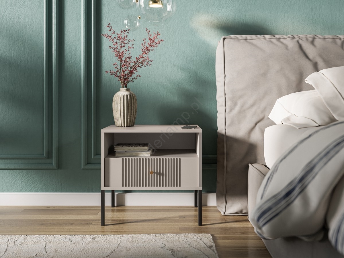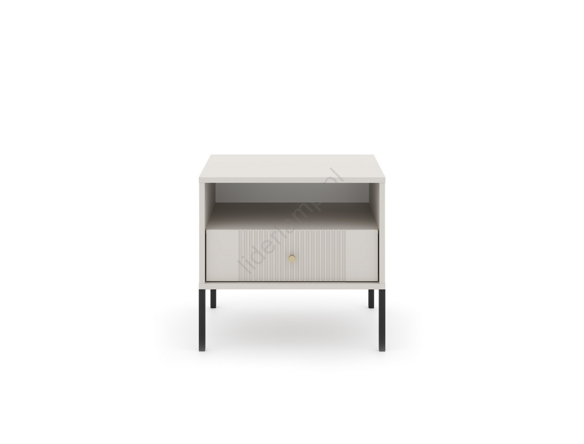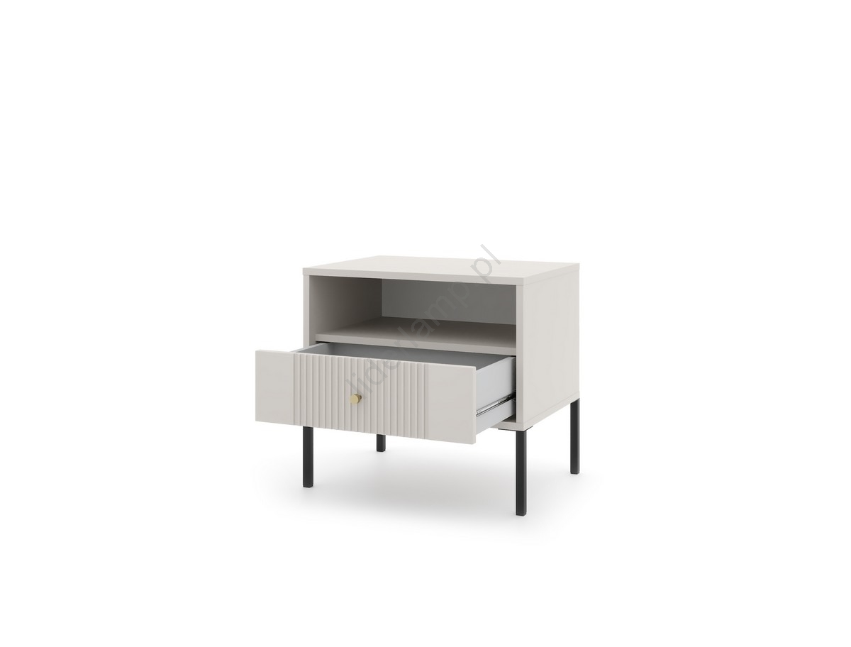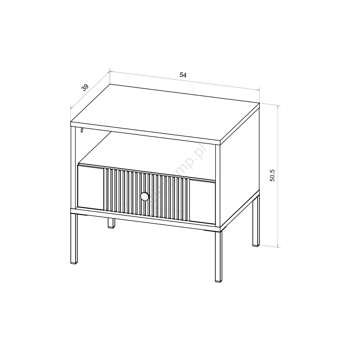 • Posiada jedną otwartą półkę i jedną szufladę ozdobioną pionowym żebrowaniem, co tworzy wyrafinowany efekt wizualny.