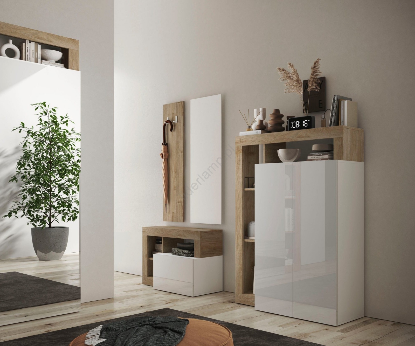 • Wyposażona w 4 otwarte półki oraz 5 wewnętrznych przegródek do przechowywania toreb, butów i rzeczy sezonowych.