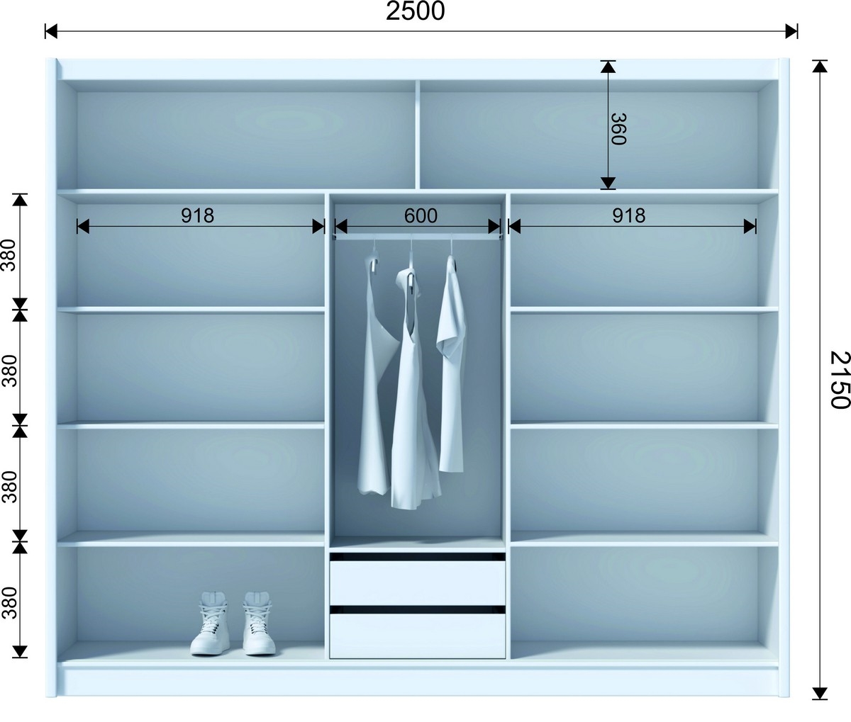 • Szafa wyposażona jest w 8 otwartych półek, drążek na ubrania, 2 górne półki oraz 4 szuflady na torby i sezonowe rzeczy.