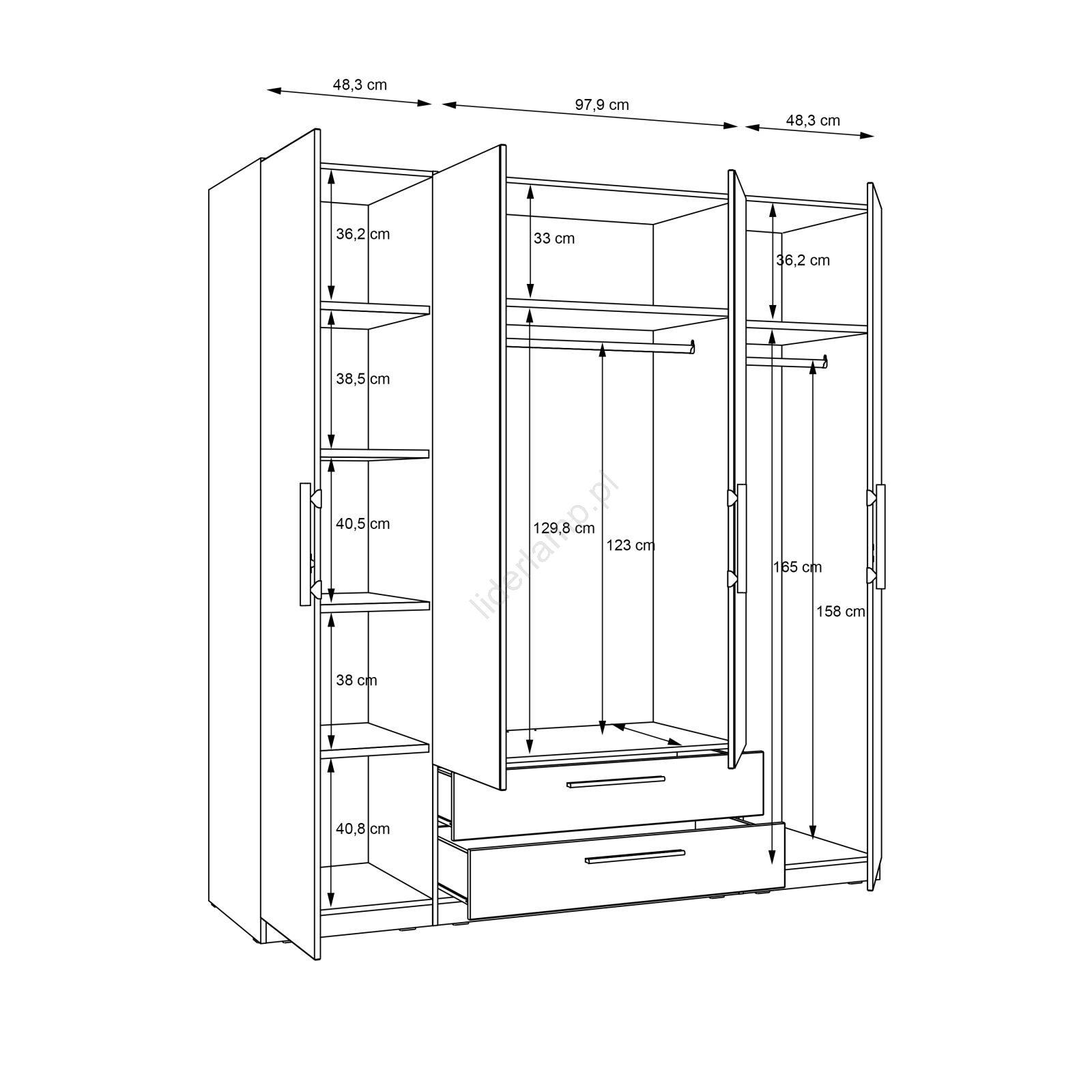 • Szafa wyposażona jest w drążki na wieszaki, szuflady, półki oraz dużą przestrzeń do przechowywania na twoje ubrania, torby i sezonowe rzeczy.