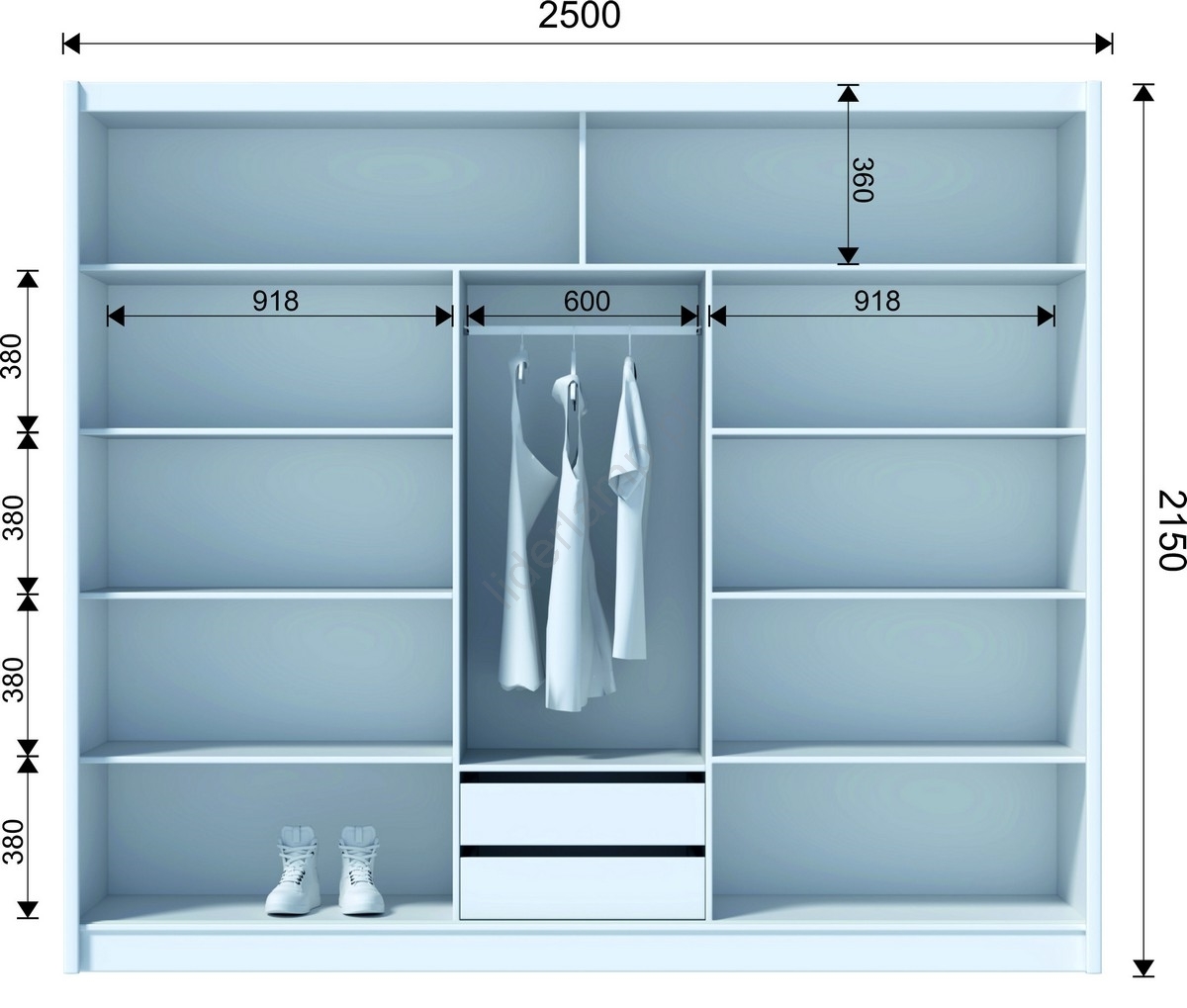 • Szafa wyposażona jest w 8 otwartych półek, 2 szuflady, drążek na ubrania oraz 2 górne półki na torby i sezonowe rzeczy.