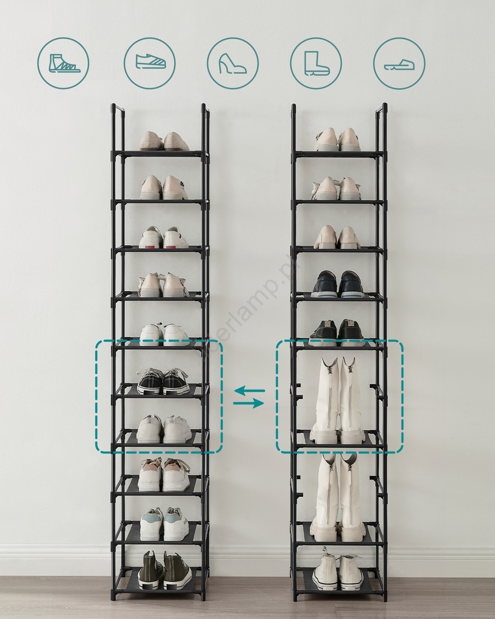 • Dzięki smukłej sylwetce ten stojak na buty z 10 półkami zajmuje niewiele miejsca na podłodze, a jednocześnie oferuje dużo miejsca do przechowywania.