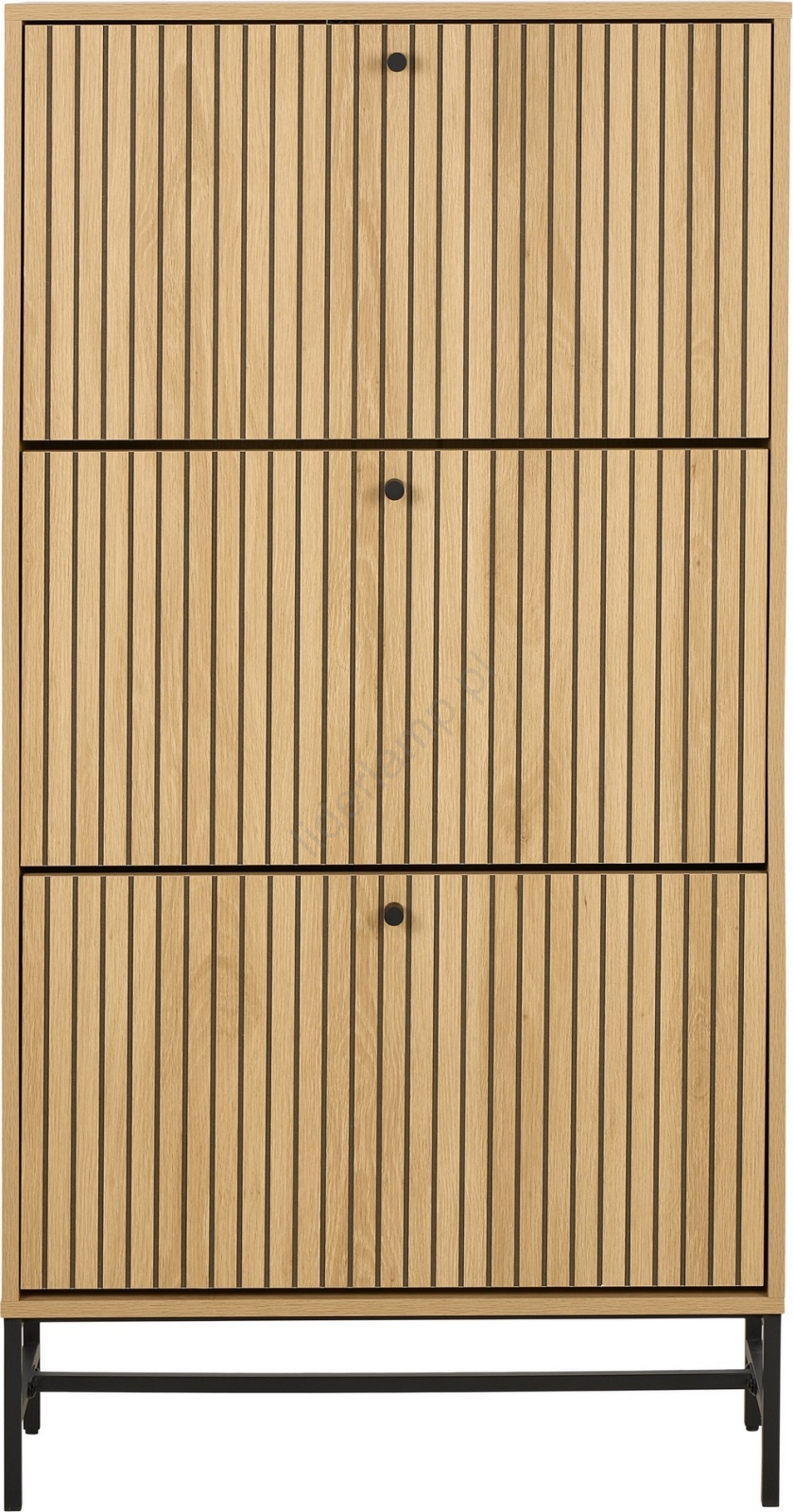 • Ta skrzynia na buty w dębowym wykończeniu z lamelowym frontem doda Twojemu przedpokojowi stylu i funkcjonalności.