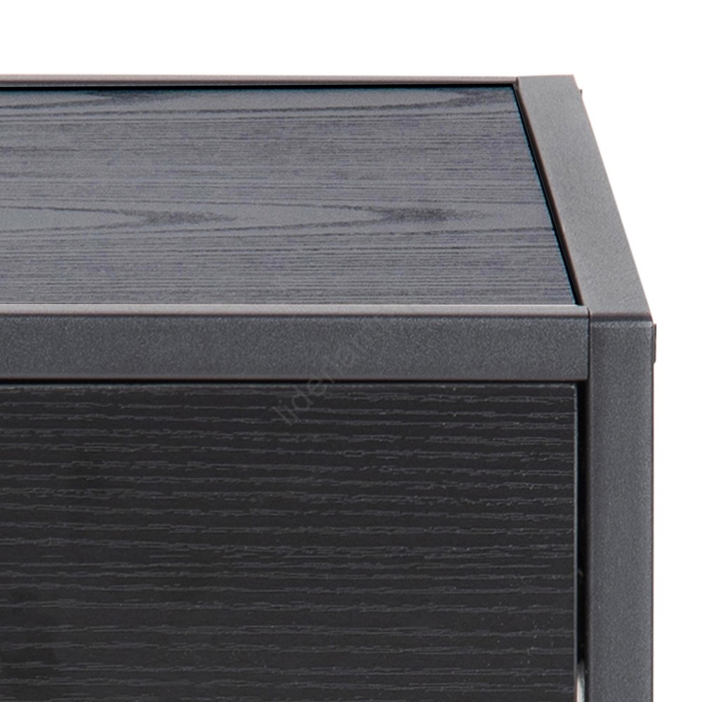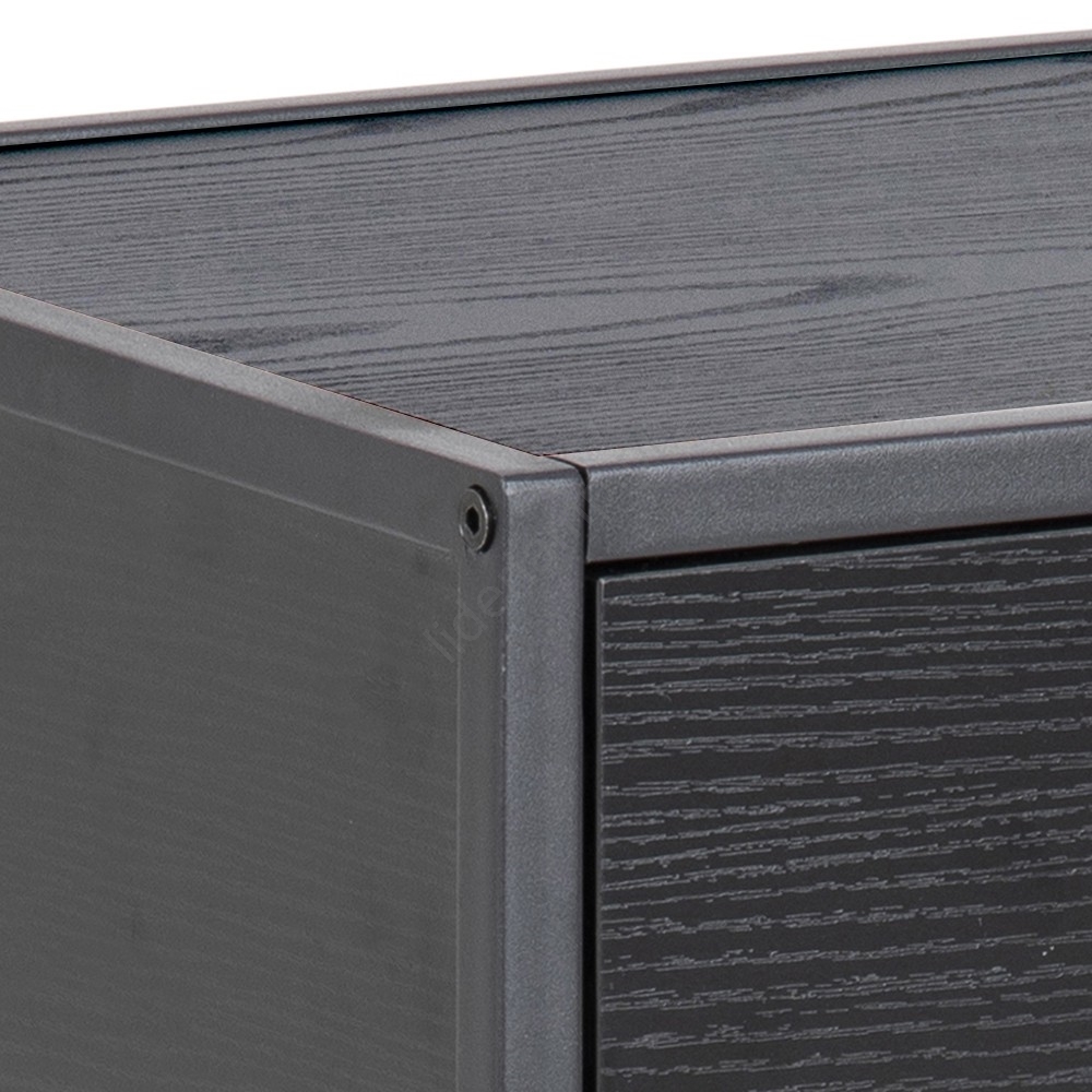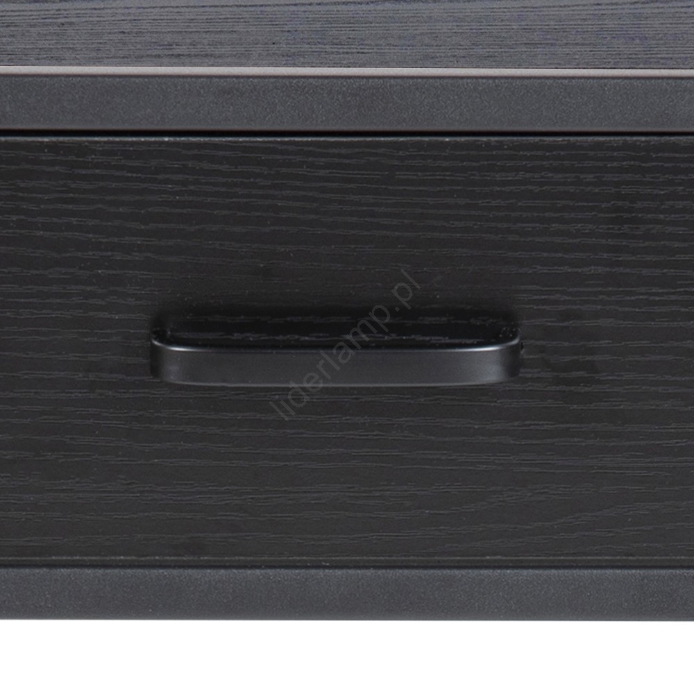 • Blat, rama, szuflada i półki z czarnej melaminy o chropowatej strukturze, podstawa z matowej czarnej stali z chropowatą powłoką proszkową i metalowymi prowadnicami.