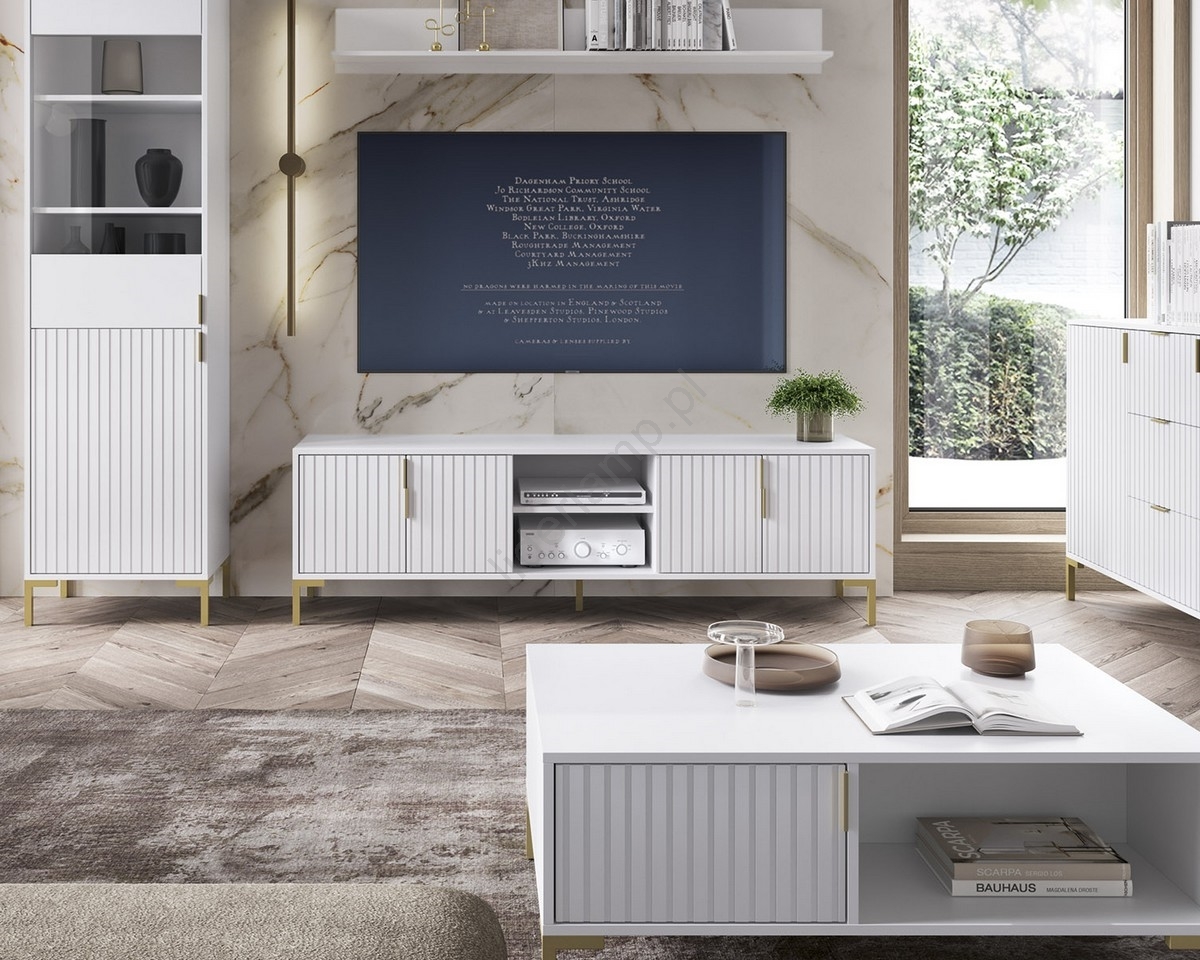 • Posiada dwie zamykane boczne szafki, każda z dwoma drzwiczkami z symetrycznymi uchwytami i ozdobnym żłobkowaniem, oraz dwie otwarte półki z otworem na przewód na środku.