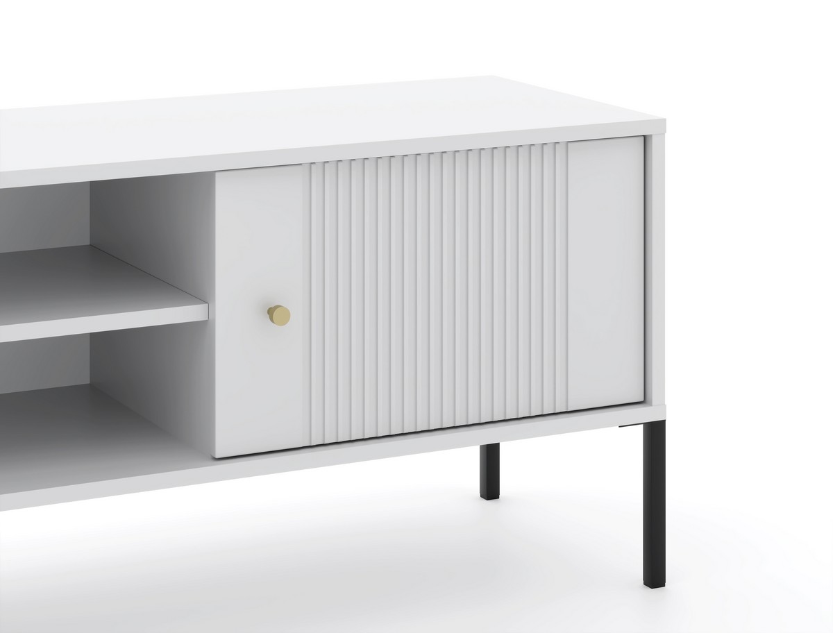 • Posiada dwie zamknięte boczne skrytki z żebrowaniem oraz dwie otwarte półki, z których jedna pośrodku ma otwór na przewody.