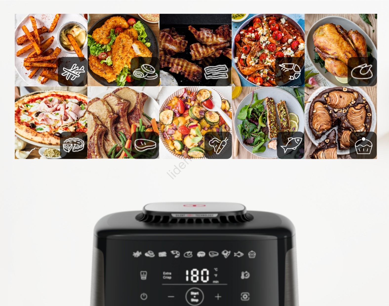 • 10 wstępnie ustawionych programów do łatwego przygotowania frytek, kurczaka, ryb, pizzy i deserów.