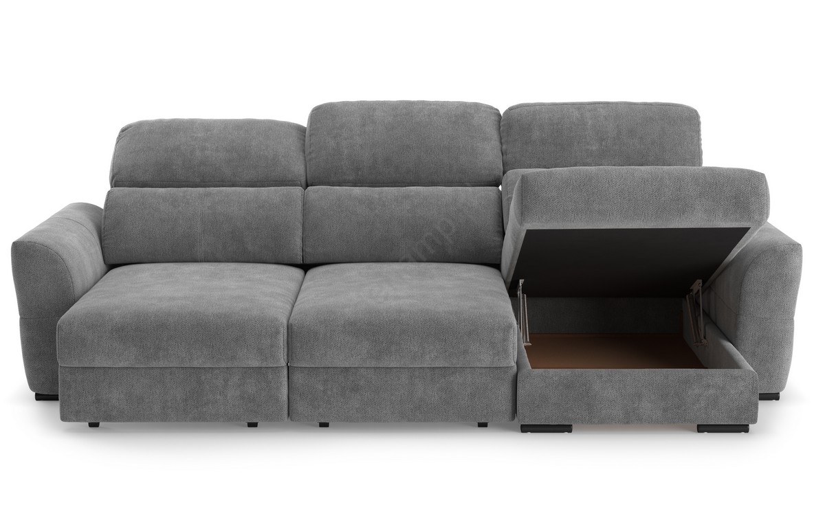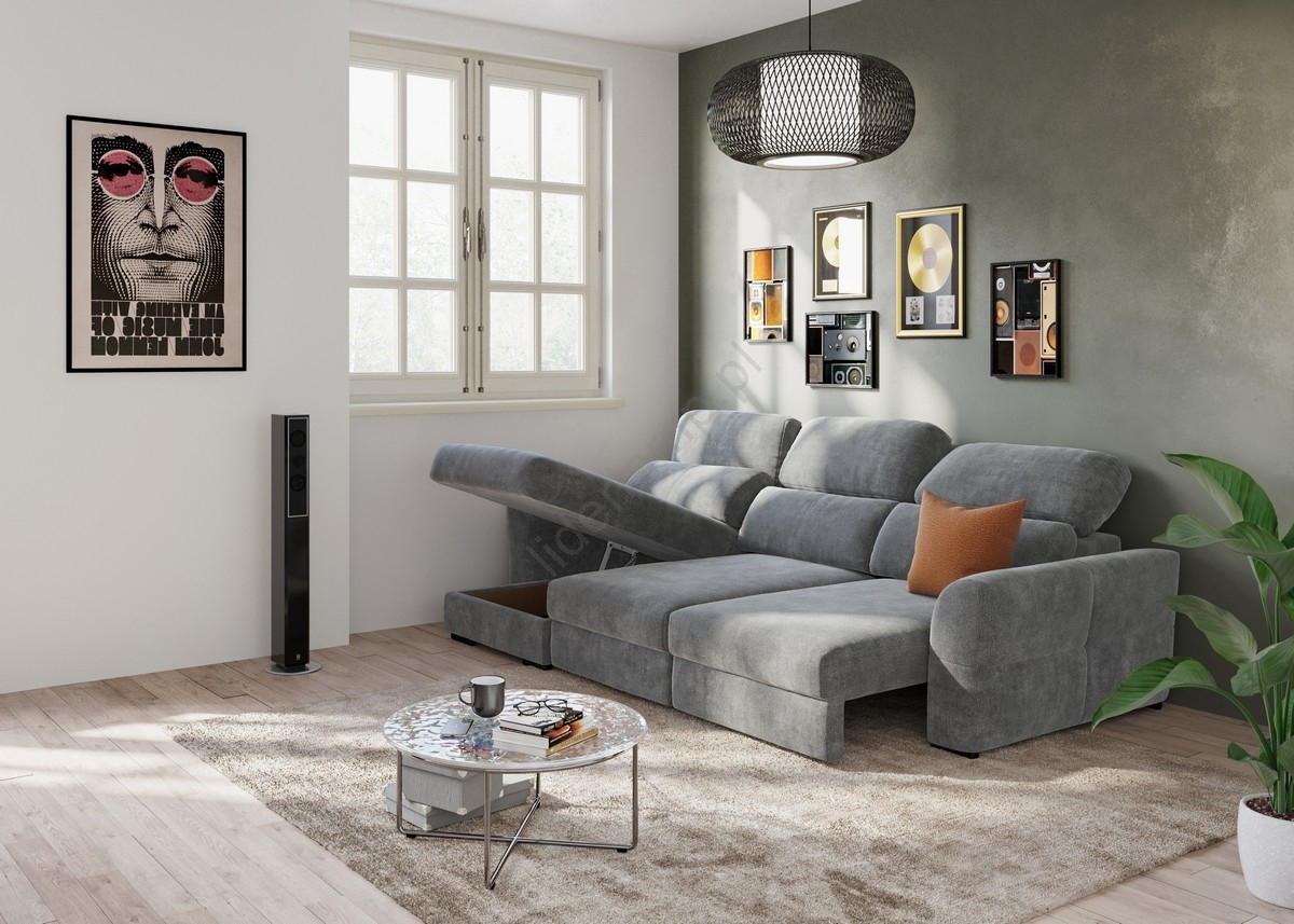 • Uniwersalna narożna rozkładana sofa trzyosobowa z pojemnikiem na pościel TRENTO szara