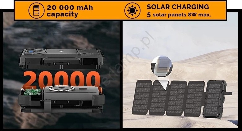 • Dzięki innowacyjnemu, rozkładanemu panelowi solarnemu możesz ładować swoje urządzenia energią słoneczną, dzięki czemu telefon, tablet i inna elektronika będą zawsze gotowe do pracy.