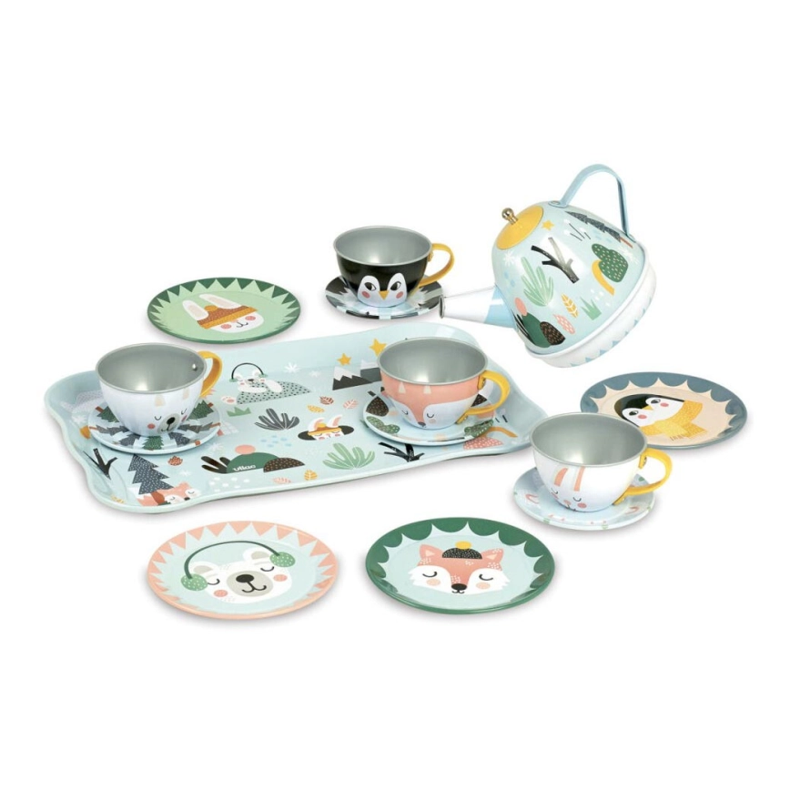 • Metalowy zestaw naczyń z piękną ilustracją zwierząt oraz podstawką pod kubki.