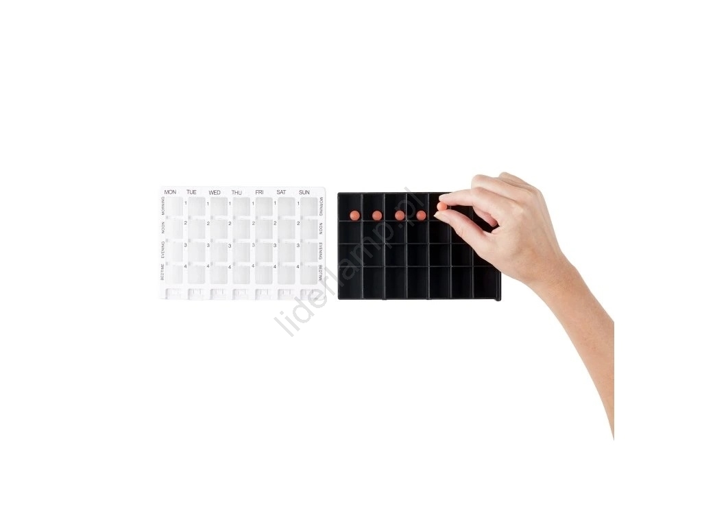 • Organizer jest podzielony na 7 kolumn (dni tygodnia) i 4 wiersze (pory dnia), co daje łącznie 28 oddzielnych przegródek.