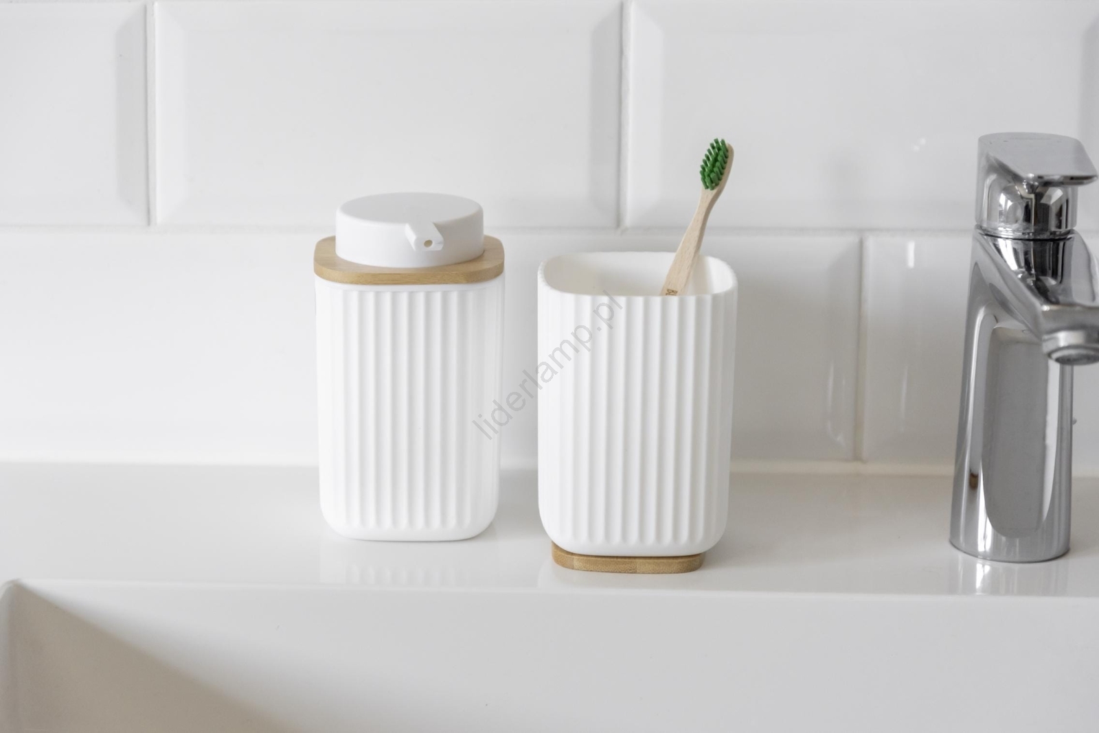 • Elegancki kubek na szczoteczki do zębów w nowoczesnym, białym wykończeniu z bambusową podstawą.