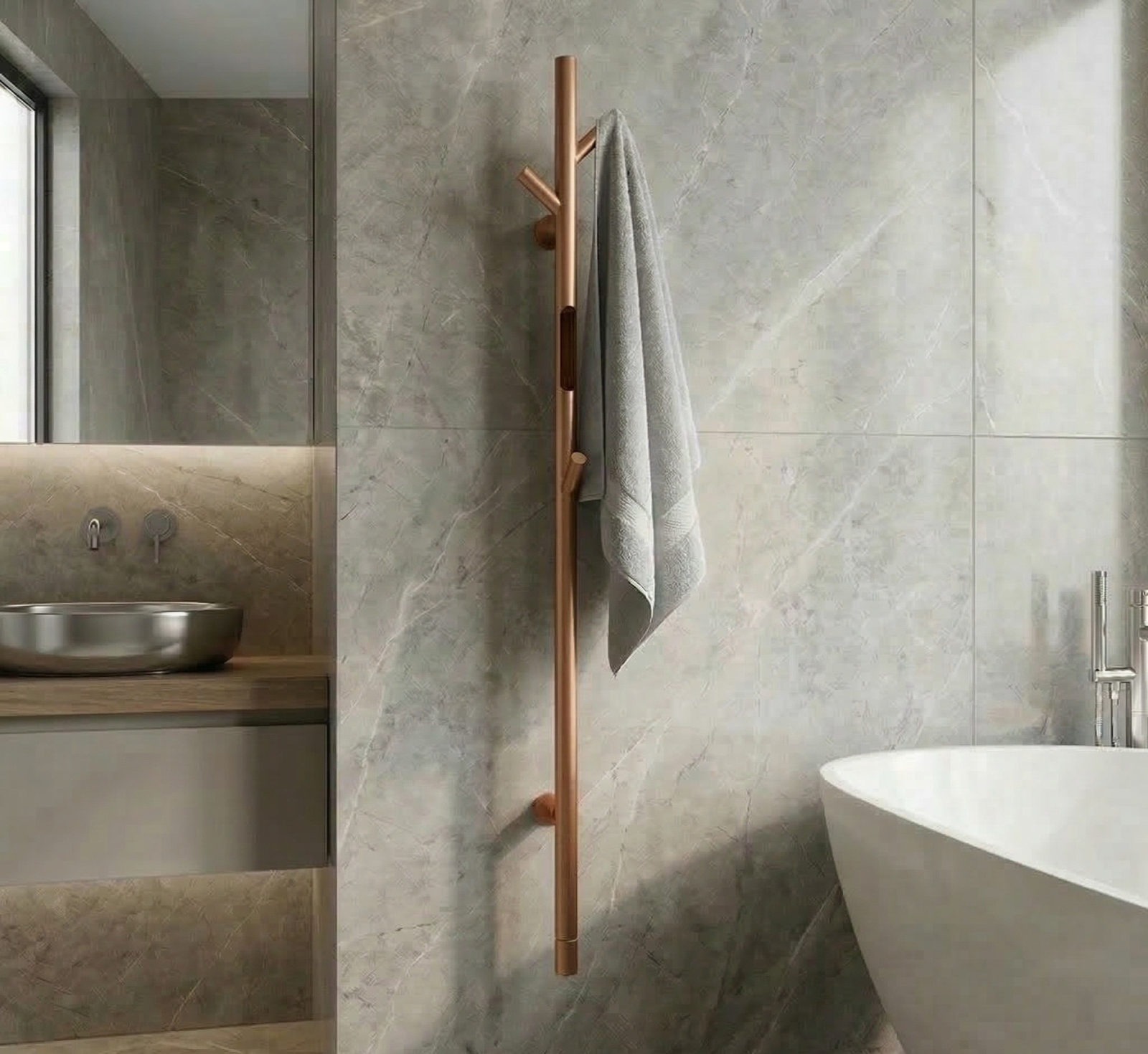 • Elektryczny wieszak na ręczniki o eleganckim wzornictwie w matowym miedziano-złotym kolorze.