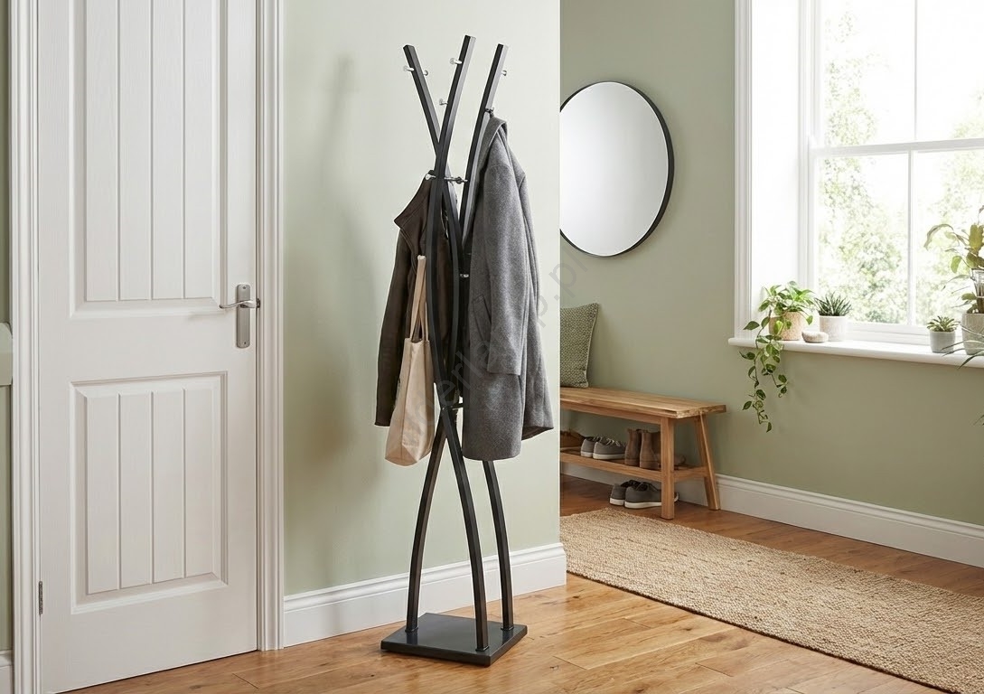 • Wprowadź do przedpokoju, biura lub poczekalni minimalistyczną elegancję dzięki temu nowoczesnemu i funkcjonalnemu wieszakowi o prostym designie.