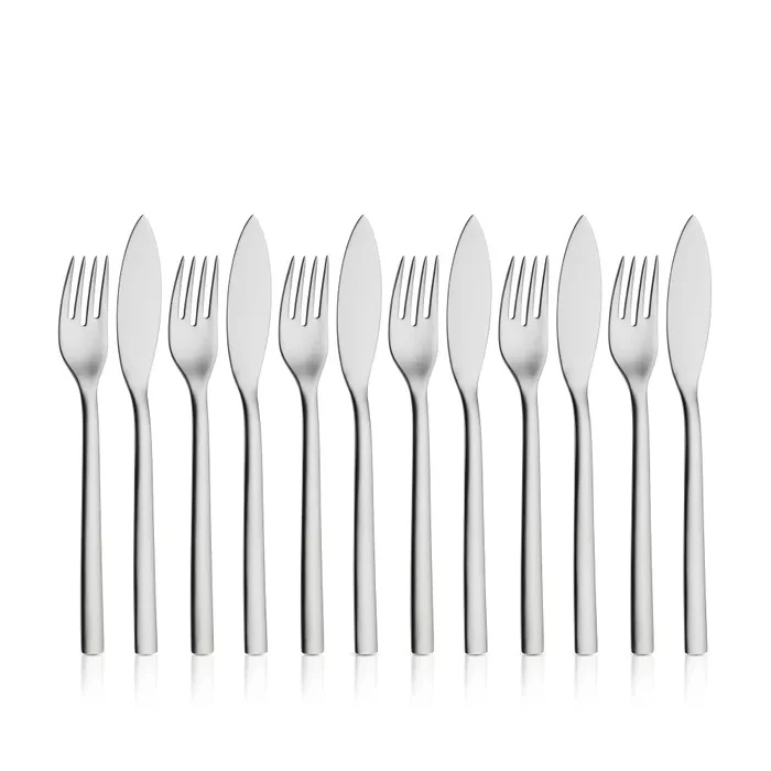 • Specjalny zestaw 12 sztuk sztućców zaprojektowany do serwowania ryb – zawiera 6 noży i 6 widelców.
