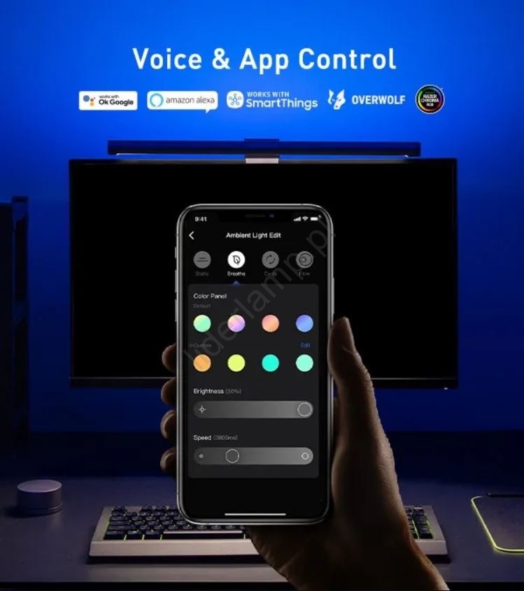 • Możesz też łatwo sterować oświetleniem monitora za pomocą głosu – Asystent Google i Amazon Alexa.