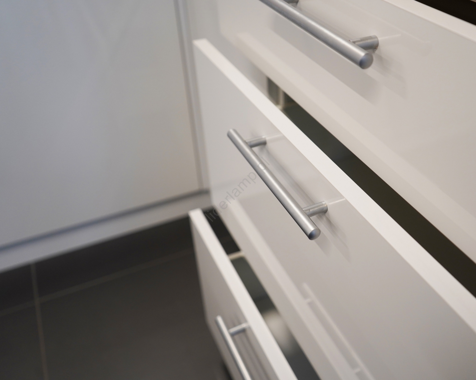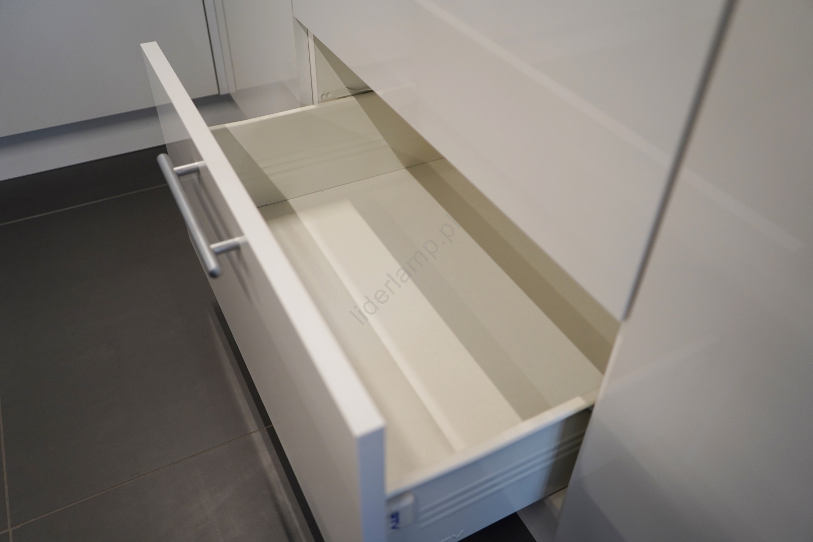 • Górne szafki są wyposażone w siłowniki gazowe, w szufladach zastosowano wysokiej jakości osłonięte metalowe prowadnice.