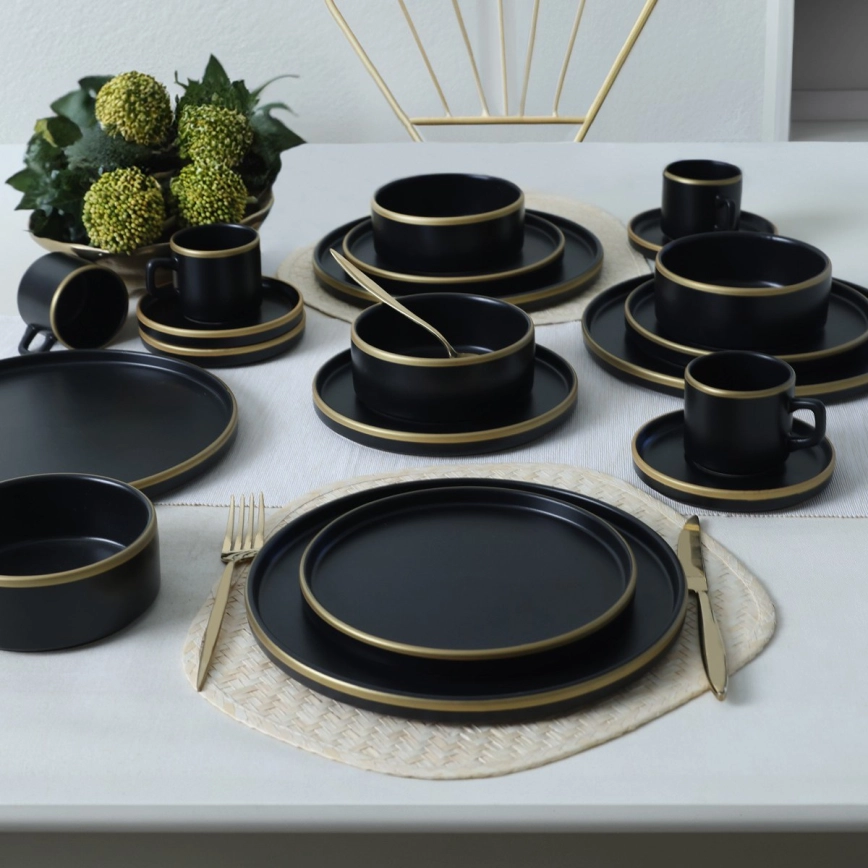 Zestaw obiadowy 20-częściowy, czarny/złoty, kamionka
