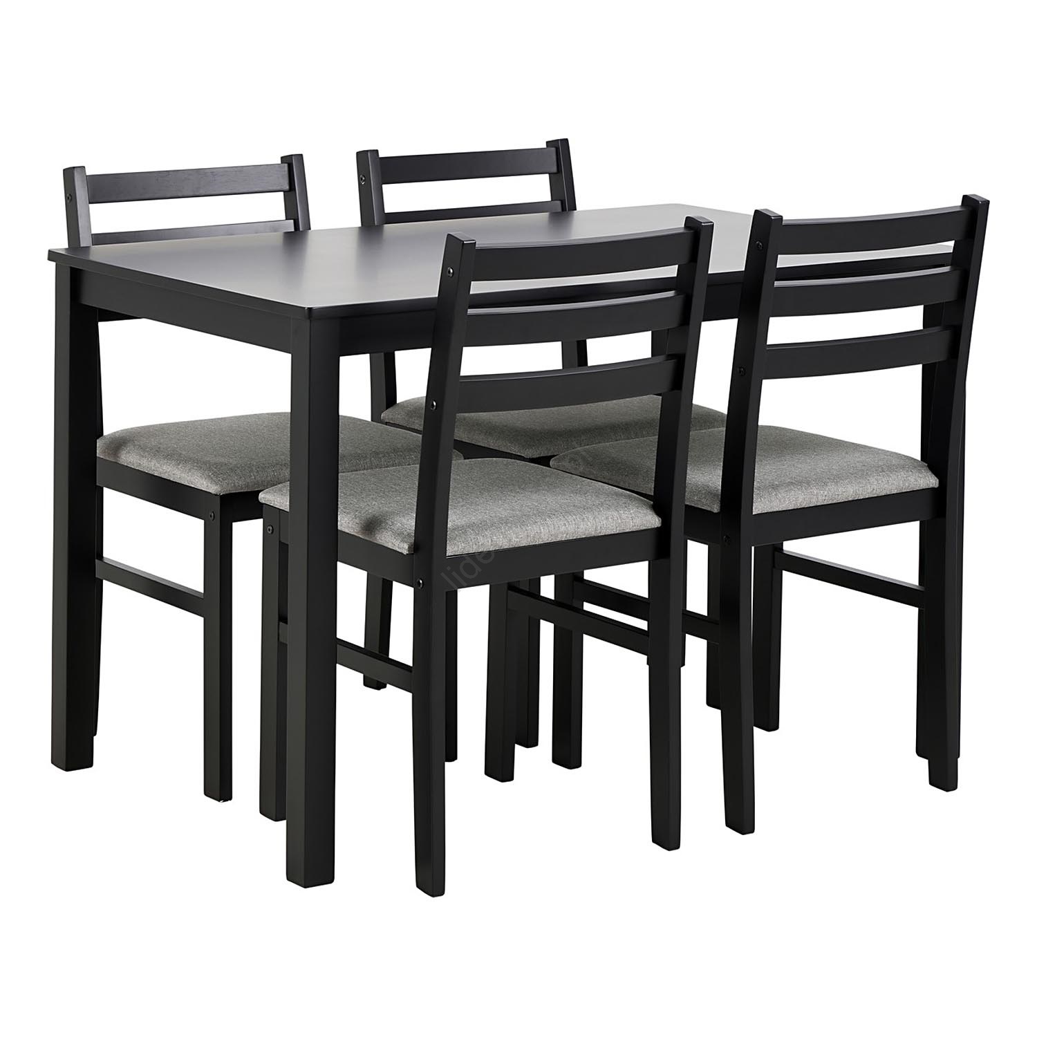 • Składa się z prostokątnego stołu jadalnego oraz 4 dopasowanych krzeseł z tapicerowanymi jasnoszarymi siedziskami, wszystko wykonane z litego drewna w matowym czarnym wykończeniu.